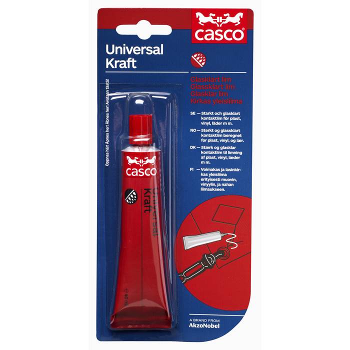 Universallim Casco Kraft är ett allroundlim för trä, porslin, glas, keramik, läder, metall, plast, mjuka PVCmaterial mm. Ger en stark och klar limfog. God beständighet mot olja, bensin, vatten och hushållskemikalier.